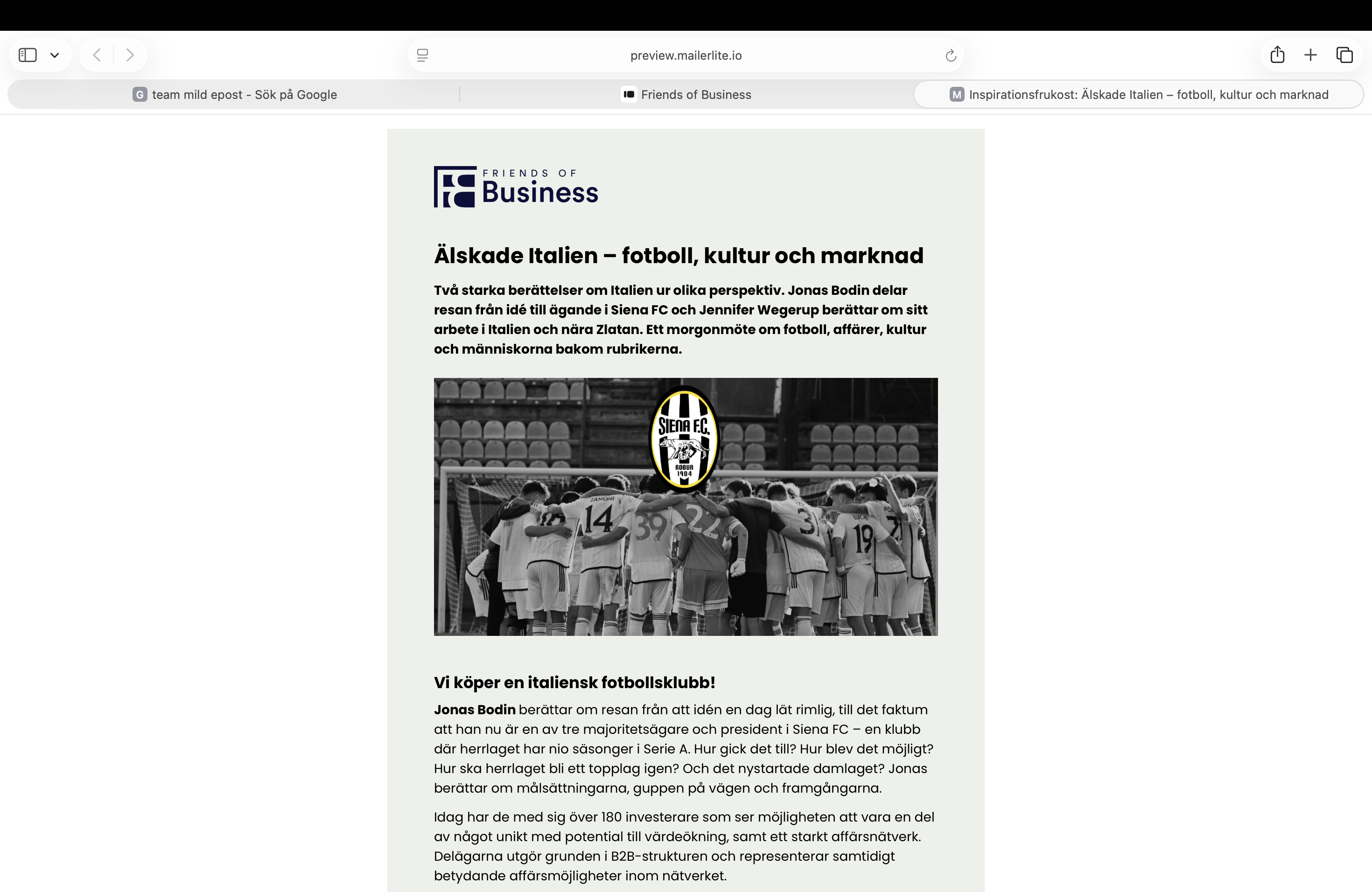 Vi köper en italiensk fotbollsklubb!Jonas Bodin berättar om resan från att idén en dag lät rimlig, till det faktum att han nu är en av tre majoritetsägare och president i Siena FC – en klubb där herrlaget har nio säsonger i Serie A.